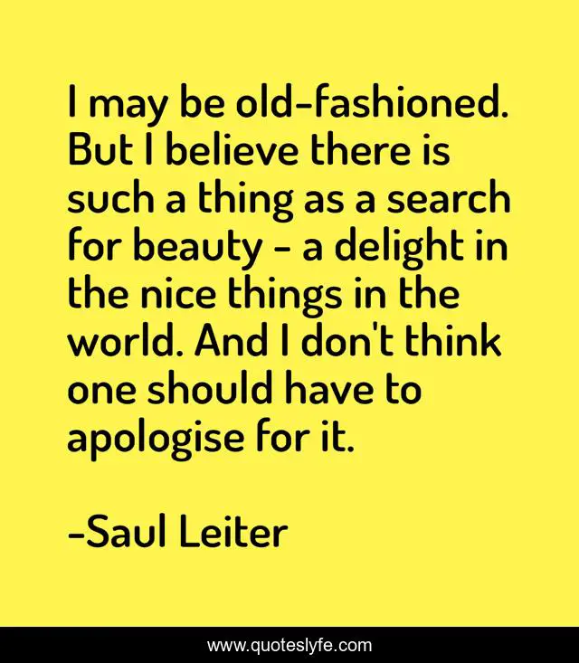 This page presents the quote "I may be old-fashioned. But I believe there is such a thing as a search for beauty - a delight in the nice things in the world. And I don't think one should have to apologise for it.". Author of this quote is Saul Leiter. This quote is about i believe, world, believe,.
