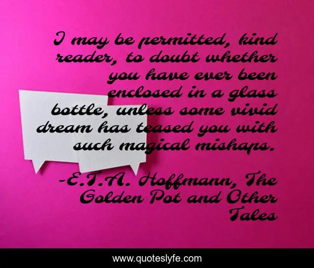 This page presents the quote "I may be permitted, kind reader, to doubt whether you have ever been enclosed in a glass bottle, unless some vivid dream has teased you with such magical mishaps.". Author of this quote is E.T.A. Hoffmann, The Golden Pot and Other Tales. This quote is about golden-pot, magic, dreams,.