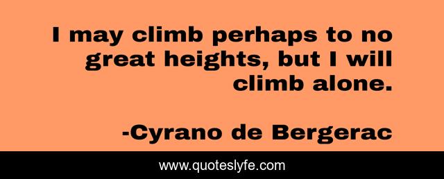 This page presents the quote "I may climb perhaps to no great heights, but I will climb alone.". Author of this quote is Cyrano de Bergerac. This quote is about great, climb, heights,.