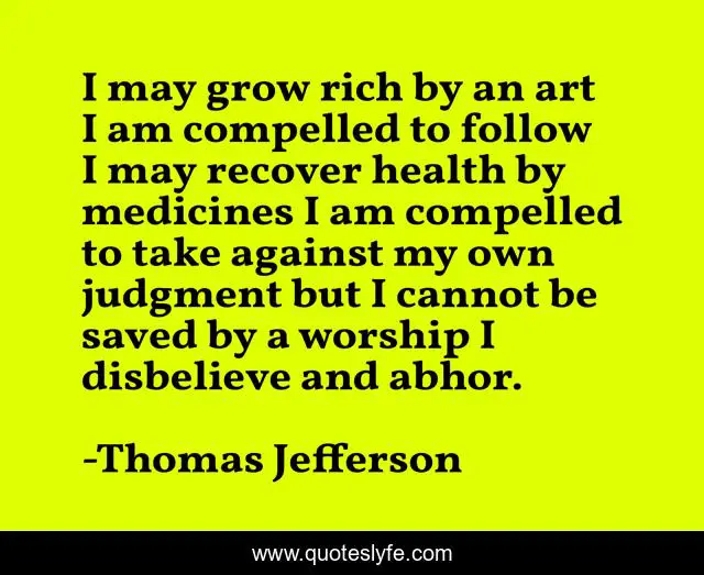 This page presents the quote "I may grow rich by an art I am compelled to follow I may recover health by medicines I am compelled to take against my own judgment but I cannot be saved by a worship I disbelieve and abhor.". Author of this quote is Thomas Jefferson. This quote is about freedom, religion,.