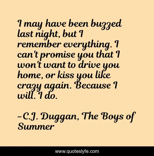 This page presents the quote "I may have been buzzed last night, but I remember everything. I can't promise you that I won't want to drive you home, or kiss you like crazy again. Because I will. I do.". Author of this quote is C.J. Duggan, The Boys of Summer. This quote is about romance, boys, young-adult, summer,.