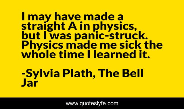 This page presents the quote "I may have made a straight A in physics, but I was panic-struck. Physics made me sick the whole time I learned it.". Author of this quote is Sylvia Plath, The Bell Jar. This quote is about school, depression,.