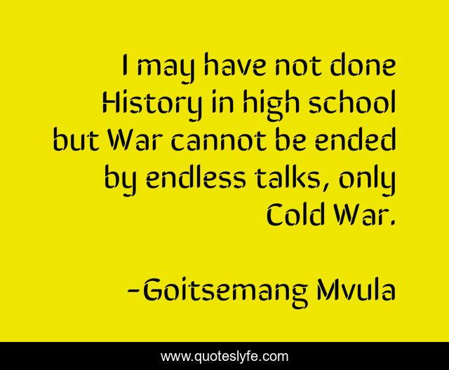 This page presents the quote "I may have not done History in high school but War cannot be ended by endless talks, only Cold War.". Author of this quote is Goitsemang Mvula. This quote is about talks, war, history,.
