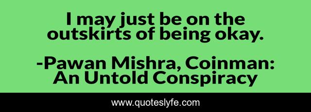 This page presents the quote "I may just be on the outskirts of being okay.". Author of this quote is Pawan Mishra, Coinman: An Untold Conspiracy. This quote is about funny, doing-good, humorous, witty, conversation, comedy,.