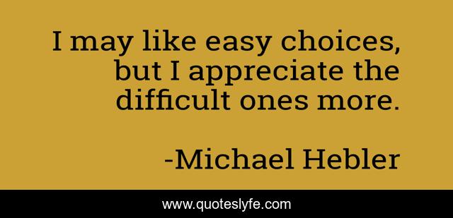 This page presents the quote "I may like easy choices, but I appreciate the difficult ones more.". Author of this quote is Michael Hebler. This quote is about life-lesson, enthusiasm, life, inspirational, inspirational-living,.