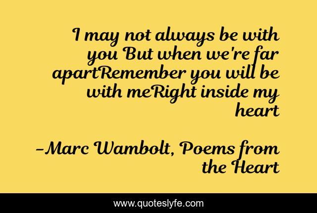 This page presents the quote "I may not always be with you But when we're far apartRemember you will be with meRight inside my heart". Author of this quote is Marc Wambolt, Poems from the Heart. This quote is about relationships, love, family, poetry, inspirational, enthusiasm, friendship, affection,.