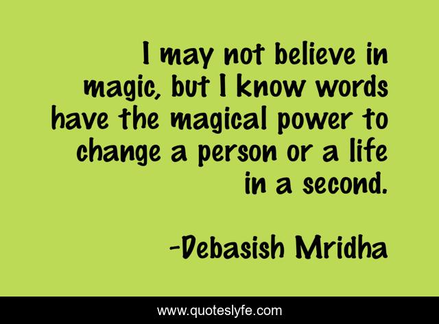 This page presents the quote "I may not believe in magic, but I know words have the magical power to change a person or a life in a second.". Author of this quote is Debasish Mridha. This quote is about miraboli, oscar-wilde, change-a-life, philosophy, debasish-mridha, tagore, quotes, magical-power, buddha,.