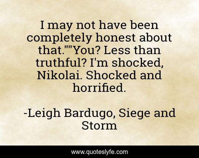 This page presents the quote "I may not have been completely honest about that.""You? Less than truthful? I'm shocked, Nikolai. Shocked and horrified.". Author of this quote is Leigh Bardugo, Siege and Storm. This quote is about funny, alina, comedy, nikolai,.