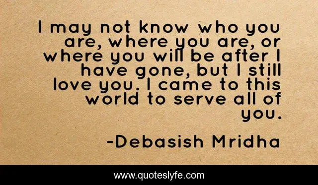 This page presents the quote "I may not know who you are, where you are, or where you will be after I have gone, but I still love you. I came to this world to serve all of you.". Author of this quote is Debasish Mridha. This quote is about i-still-love-you, love, philosophy, debasish-mridha, serve-the-world, debasish-mridha-md, inspirational, enthusiasm, affection,.