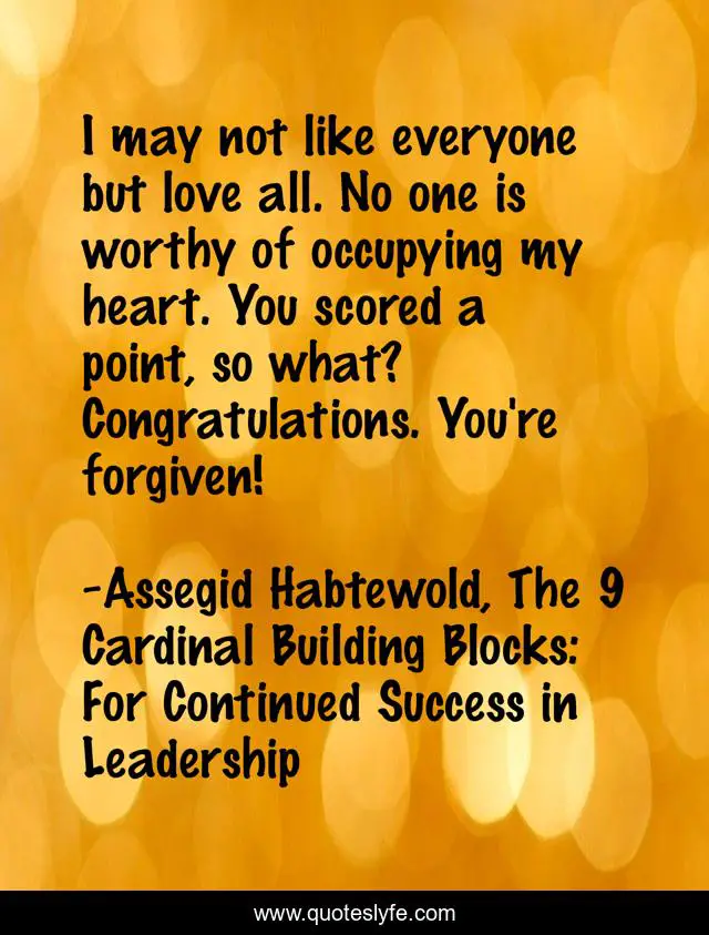 This page presents the quote "I may not like everyone but love all. No one is worthy of occupying my heart. You scored a point, so what? Congratulations. You're forgiven!". Author of this quote is Assegid Habtewold, The 9 Cardinal Building Blocks: For Continued Success in Leadership. This quote is about forgiveness, love-all,.