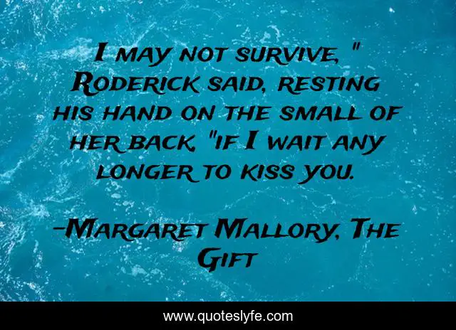 This page presents the quote "I may not survive, " Roderick said, resting his hand on the small of her back, "if I wait any longer to kiss you.". Author of this quote is Margaret Mallory, The Gift. This quote is about highlanders-romance, seers, witches, scottish-romance,.