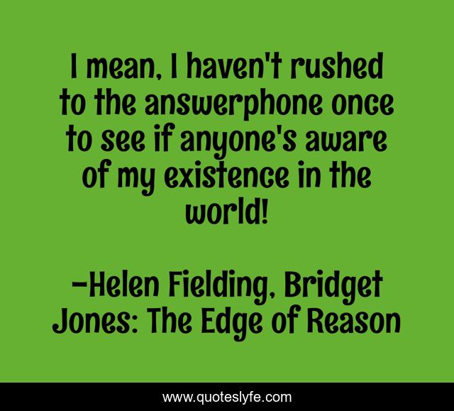 This page presents the quote "I mean, I haven't rushed to the answerphone once to see if anyone's aware of my existence in the world!". Author of this quote is Helen Fielding, Bridget Jones: The Edge of Reason. This quote is about alone, world, bridget-jones, mark-darcy,.