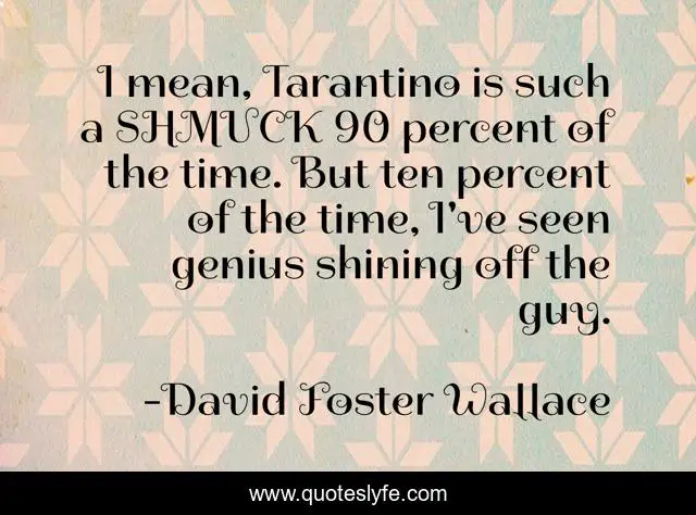 This page presents the quote "I mean, Tarantino is such a SHMUCK 90 percent of the time. But ten percent of the time, I've seen genius shining off the guy.". Author of this quote is David Foster Wallace. This quote is about genius, schmuck, quentin-tarantino,.