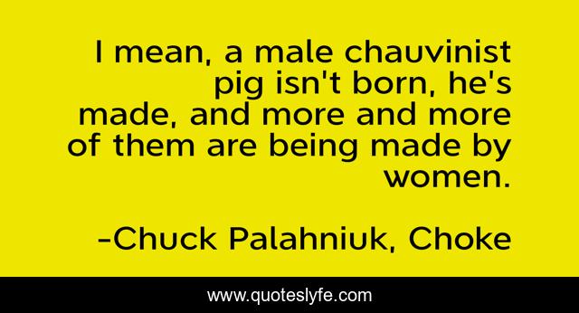 This page presents the quote "I mean, a male chauvinist pig isn't born, he's made, and more and more of them are being made by women.". Author of this quote is Chuck Palahniuk, Choke. This quote is about men, women,.
