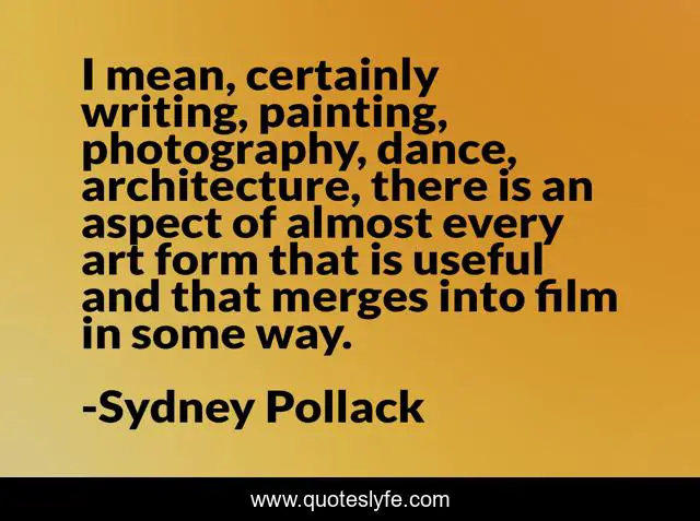 This page presents the quote "I mean, certainly writing, painting, photography, dance, architecture, there is an aspect of almost every art form that is useful and that merges into film in some way.". Author of this quote is Sydney Pollack. This quote is about dance, art, writing,.