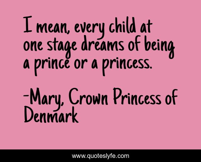This page presents the quote "I mean, every child at one stage dreams of being a prince or a princess.". Author of this quote is Mary, Crown Princess of Denmark. This quote is about child, princess, mean,.