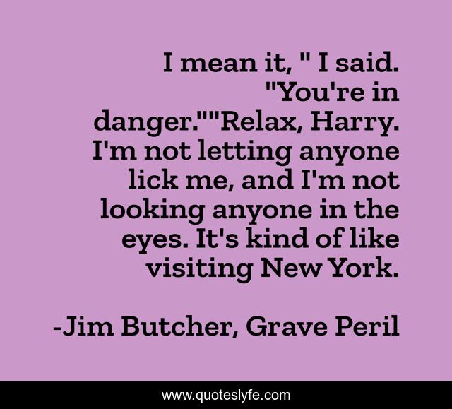 This page presents the quote "I mean it, " I said. "You're in danger.""Relax, Harry. I'm not letting anyone lick me, and I'm not looking anyone in the eyes. It's kind of like visiting New York.". Author of this quote is Jim Butcher, Grave Peril. This quote is about new-york-city, humor,.