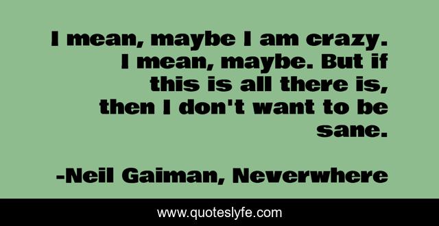 This page presents the quote "I mean, maybe I am crazy. I mean, maybe. But if this is all there is, then I don't want to be sane.". Author of this quote is Neil Gaiman, Neverwhere. This quote is about sanity, insanity,.