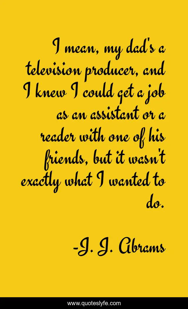 This page presents the quote "I mean, my dad's a television producer, and I knew I could get a job as an assistant or a reader with one of his friends, but it wasn't exactly what I wanted to do.". Author of this quote is J. J. Abrams. This quote is about job, friends, television,.