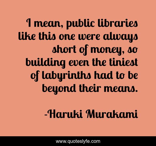 This page presents the quote "I mean, public libraries like this one were always short of money, so building even the tiniest of labyrinths had to be beyond their means.". Author of this quote is Haruki Murakami. This quote is about libraries, labryrinth, funding, library,.