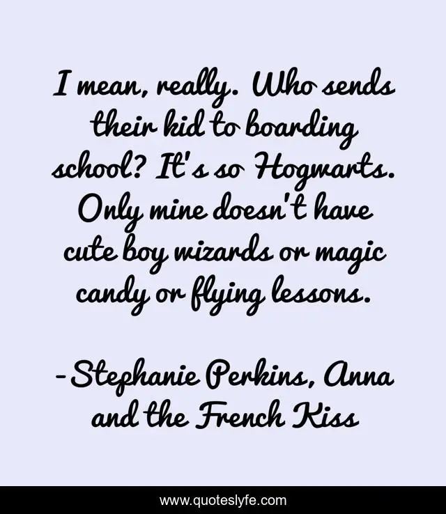This page presents the quote "I mean, really. Who sends their kid to boarding school? It's so Hogwarts. Only mine doesn't have cute boy wizards or magic candy or flying lessons.". Author of this quote is Stephanie Perkins, Anna and the French Kiss. .