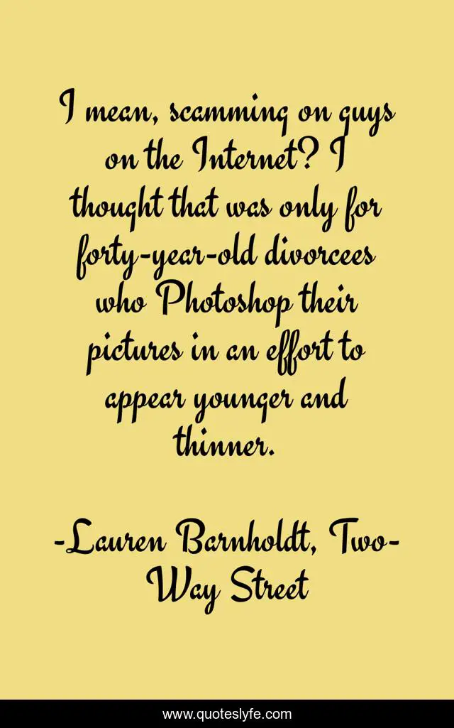 This page presents the quote "I mean, scamming on guys on the Internet? I thought that was only for forty-year-old divorcees who Photoshop their pictures in an effort to appear younger and thinner.". Author of this quote is Lauren Barnholdt, Two-Way Street. This quote is about humor, internet,.