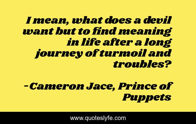 This page presents the quote "I mean, what does a devil want but to find meaning in life after a long journey of turmoil and troubles?". Author of this quote is Cameron Jace, Prince of Puppets. This quote is about devil, humor, diary-entry,.