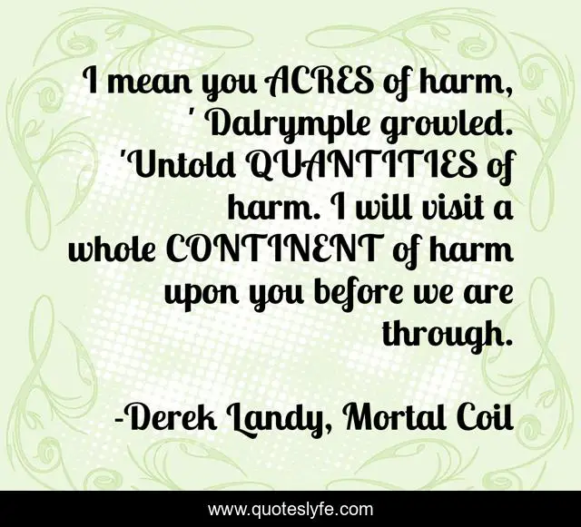 This page presents the quote "I mean you ACRES of harm, ' Dalrymple growled. 'Untold QUANTITIES of harm. I will visit a whole CONTINENT of harm upon you before we are through.". Author of this quote is Derek Landy, Mortal Coil. This quote is about humorous, humor, threats, what-the-hell,.