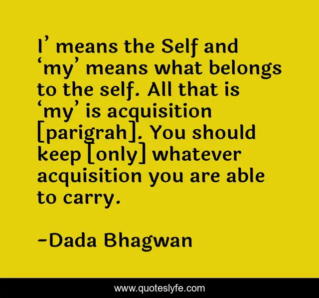 This page presents the quote "I’ means the Self and ‘my’ means what belongs to the self. All that is ‘my’ is acquisition [parigrah]. You should keep [only] whatever acquisition you are able to carry.". Author of this quote is Dada Bhagwan. This quote is about self, spiritual, acquisition,.