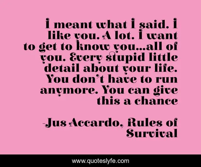 This page presents the quote "I meant what I said. I like you. A lot. I want to get to know you…all of you. Every stupid little detail about your life. You don’t have to run anymore. You can give this a chance". Author of this quote is Jus Accardo, Rules of Survival. This quote is about action, romance, rules-of-survival,.