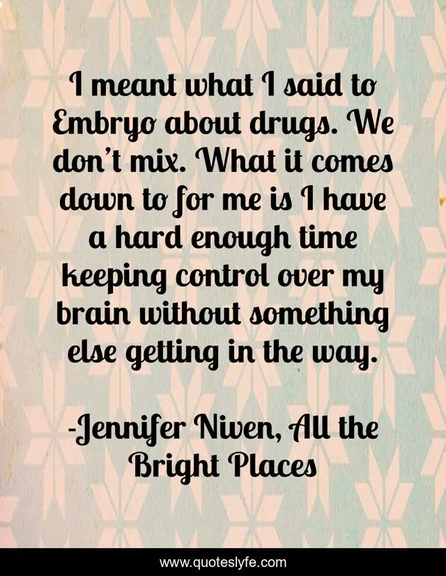 This page presents the quote "I meant what I said to Embryo about drugs. We don’t mix. What it comes down to for me is I have a hard enough time keeping control over my brain without something else getting in the way.". Author of this quote is Jennifer Niven, All the Bright Places. This quote is about control, brain, drugs,.