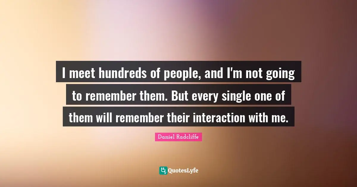 This page presents the quote "I meet hundreds of people, and I'm not going to remember them. But every single one of them will remember their interaction with me.". Author of this quote is Daniel Radcliffe. This quote is about people, interaction, remember, single,.