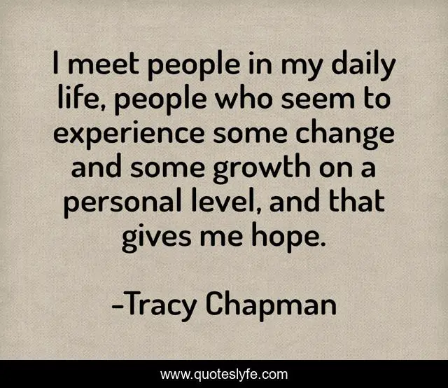 This page presents the quote "I meet people in my daily life, people who seem to experience some change and some growth on a personal level, and that gives me hope.". Author of this quote is Tracy Chapman. This quote is about life, change, daily,.