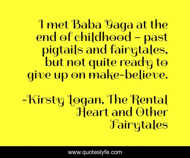 This page presents the quote "I met Baba Yaga at the end of childhood – past pigtails and fairytales, but not quite ready to give up on make-believe.". Author of this quote is Kirsty Logan, The Rental Heart and Other Fairytales. This quote is about fairytales, fairytale, adolescence, teenage, childhood,.