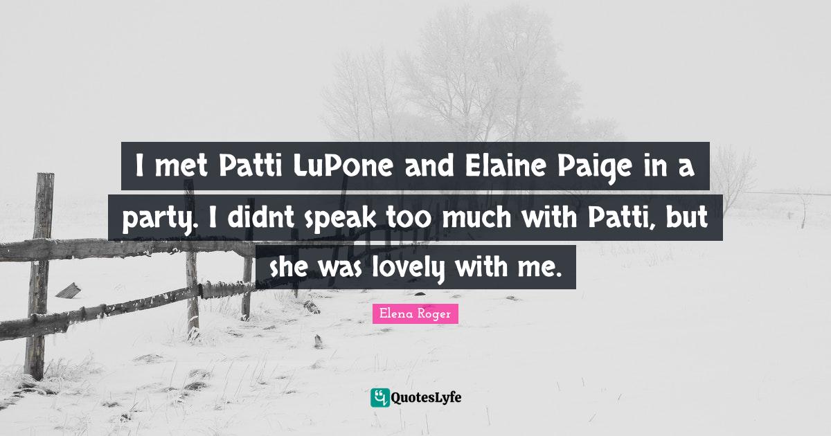 This page presents the quote "I met Patti LuPone and Elaine Paige in a party. I didnt speak too much with Patti, but she was lovely with me.". Author of this quote is Elena Roger. This quote is about party, lovely, speak, too much,.