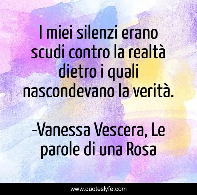 This page presents the quote "I miei silenzi erano scudi contro la realtà dietro i quali nascondevano la verità.". Author of this quote is Vanessa Vescera, Le parole di una Rosa. This quote is about quotes, book-lovers,.