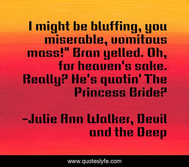 This page presents the quote "I might be bluffing, you miserable, vomitous mass!" Bran yelled. Oh, for heaven's sake. Really? He's quotin' The Princess Bride?". Author of this quote is Julie Ann Walker, Devil and the Deep. .