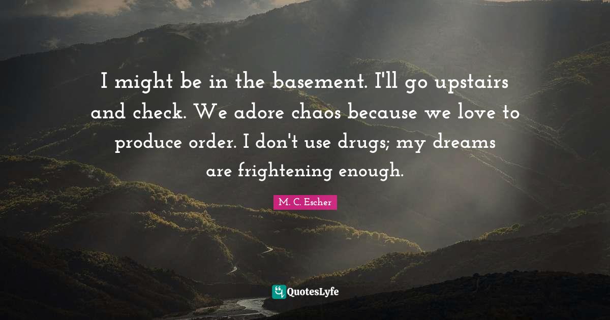 This page presents the quote "I might be in the basement. I'll go upstairs and check. We adore chaos because we love to produce order. I don't use drugs; my dreams are frightening enough.". Author of this quote is M. C. Escher. This quote is about love, order, frightening, dream, chaos, upstairs, use, funny, adore,.