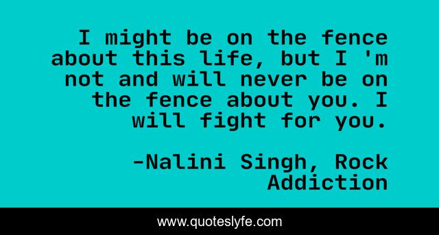 This page presents the quote "I might be on the fence about this life, but I 'm not and will never be on the fence about you. I will fight for you.". Author of this quote is Nalini Singh, Rock Addiction. .