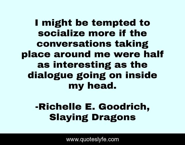 This page presents the quote "I might be tempted to socialize more if the conversations taking place around me were half as interesting as the dialogue going on inside my head.". Author of this quote is Richelle E. Goodrich, Slaying Dragons. This quote is about imaginary-friends, author, conversations, authors, interesting-conversations, richelle, richelle-e-goodrich, richelle-goodrich, being-social,.
