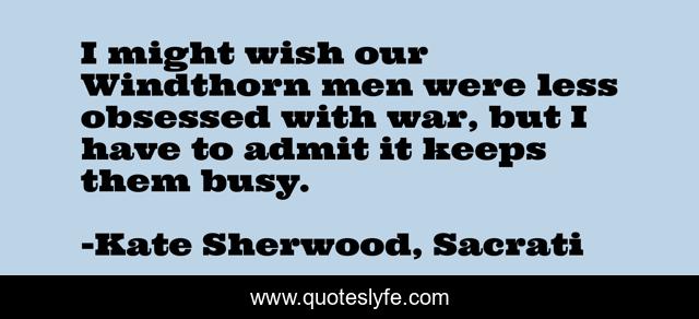 This page presents the quote "I might wish our Windthorn men were less obsessed with war, but I have to admit it keeps them busy.". Author of this quote is Kate Sherwood, Sacrati. .