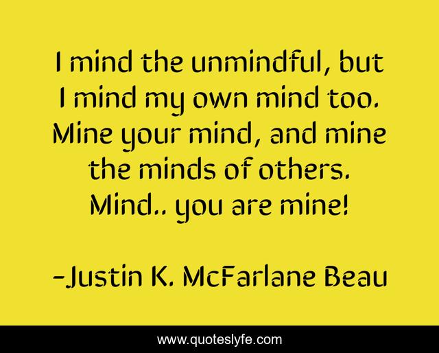 This page presents the quote "I mind the unmindful, but I mind my own mind too. Mine your mind, and mine the minds of others. Mind.. you are mine!". Author of this quote is Justin K. McFarlane Beau. This quote is about control, mining, power, mindfulness, mentality, psychic, mind, mine, deep,.