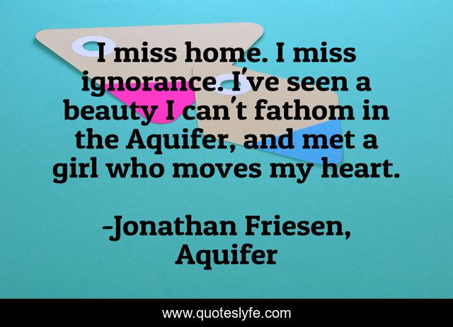 This page presents the quote "I miss home. I miss ignorance. I've seen a beauty I can't fathom in the Aquifer, and met a girl who moves my heart.". Author of this quote is Jonathan Friesen, Aquifer. This quote is about life, love, ignorance, affection, fiction,.