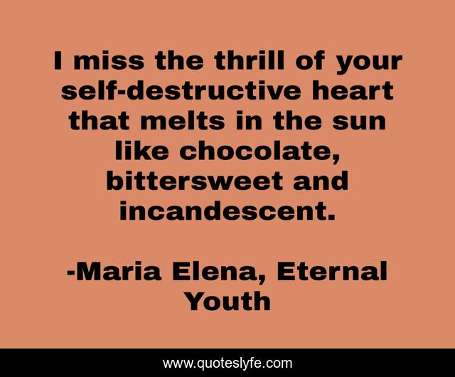 This page presents the quote "I miss the thrill of your self-destructive heart that melts in the sun like chocolate, bittersweet and incandescent.". Author of this quote is Maria Elena, Eternal Youth. This quote is about bittersweet, love, self-destruction, sun, nostalgia, chocolate, affection,.