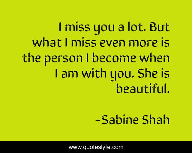 This page presents the quote "I miss you a lot. But what I miss even more is the person I become when I am with you. She is beautiful.". Author of this quote is Sabine Shah. This quote is about beautiful, love, affection,.