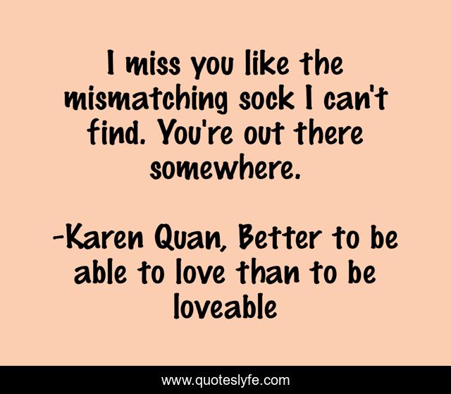 "Karen Quan, Better to be able to love than to be loveable Quotes." Quoteslyfe.com, 2025. Fri. 05 Dec. 2025. <https://www.quoteslyfe.com/quote/I-miss-you-like-the-mismatching-sock-239112>.