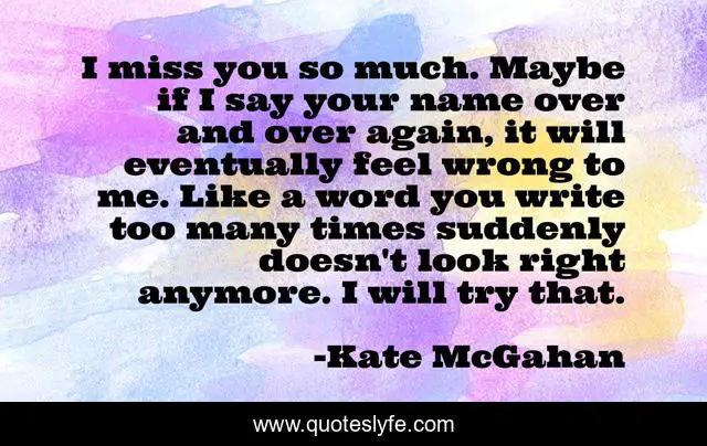 This page presents the quote "I miss you so much. Maybe if I say your name over and over again, it will eventually feel wrong to me. Like a word you write too many times suddenly doesn't look right anymore. I will try that.". Author of this quote is Kate McGahan. This quote is about loss, love, heal, grief, wrong, write, miss, affection,.