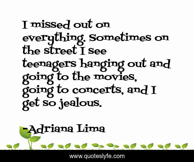 This page presents the quote "I missed out on everything. Sometimes on the street I see teenagers hanging out and going to the movies, going to concerts, and I get so jealous.". Author of this quote is Adriana Lima. This quote is about jealous, see, street,.