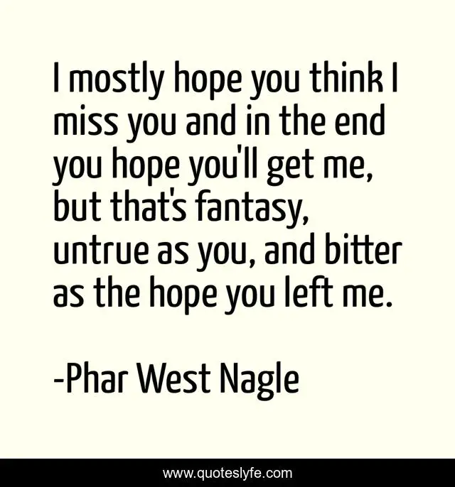This page presents the quote "I mostly hope you think I miss you and in the end you hope you'll get me, but that's fantasy, untrue as you, and bitter as the hope you left me.". Author of this quote is Phar West Nagle. This quote is about relationships, hatred, heartbreak, poetry,.