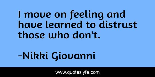 This page presents the quote "I move on feeling and have learned to distrust those who don't.". Author of this quote is Nikki Giovanni. .